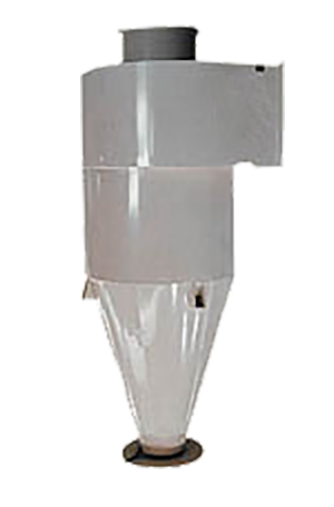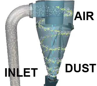 Cyclones are designed to separate air laden with particles of dust. Dirty air enters through the inlet. The high turbulence breaks and separates the heavier and lighter material particles. The moving air creates a vortex throwing the heavier particles outwards toward the cyclone wall. Airflow around the cyclone wall is reduced by friction, heavier particles get trapped in the slower airflow and gravity pulls the separated heavier particles down towards the rotary air seal.